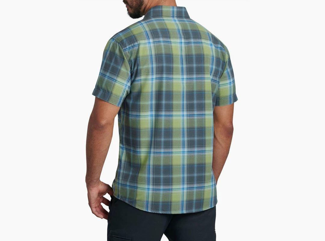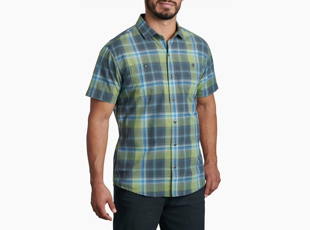 The STYKโขย Menโs Short Sleeve Shirt is cut from an exclusive lightweight fabric that has quick drying, moisture management, and UPF 30+ sun protection. This summer plaid delivers style and function with built-in stretch, a reduced modern collar, and KรHLโs signature metal buttons.