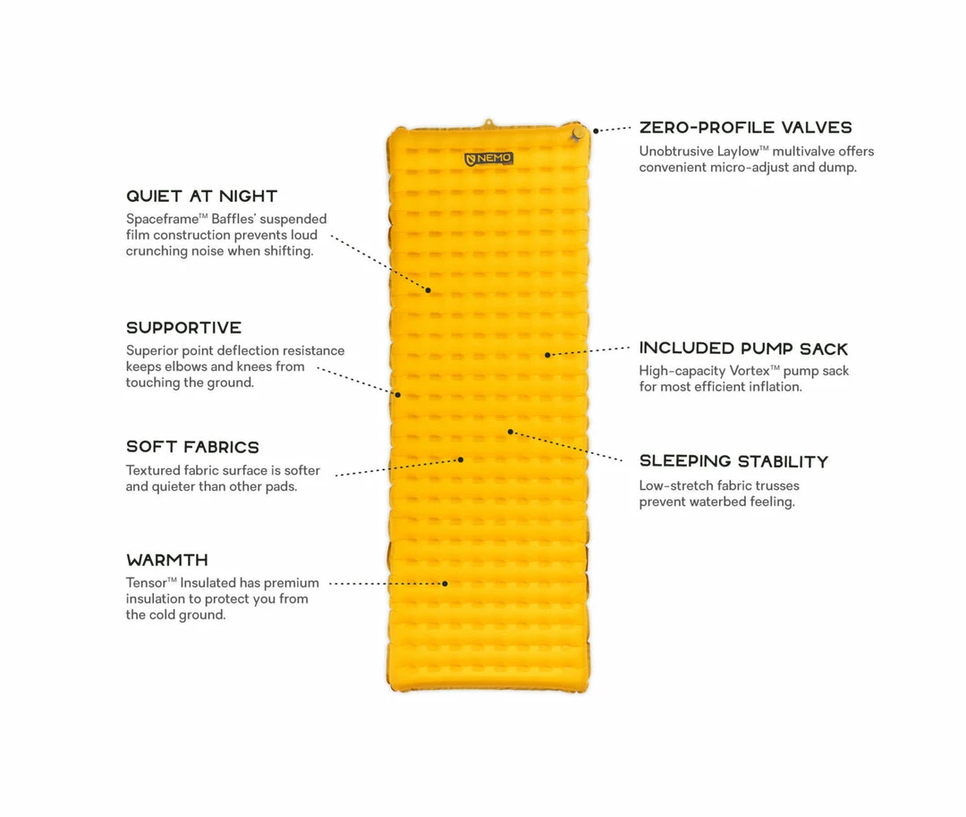 Offering quieter, more supportive sleep at a tiny packed size, Tensorâ„¢ ultralight sleeping pad stands apart as the ultimate backcountry adventurer’s best friend. Updated with a zero-profile, micro-adjustable valve and included Vortexâ„¢ pump sack, NEMO’s lightest sleeping pad uses premium 20D fabrics to shave grams without sacrificing plush comfort.